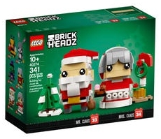- Buildable LEGO® BrickHeadz™ Mr. & Mrs. Claus construction characters feature decorated eyes, festive red and white outfits, detachable gift sack and assorted cake and cookie elements.